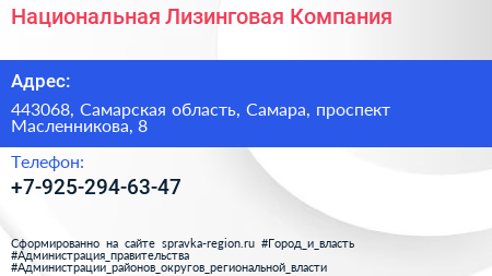 Национальная Лизинговая Компания по адресу 443068, Самарская область, Самара, проспект Масленникова, 8 в дальнейшем Организация, размещена в следующих категориях: