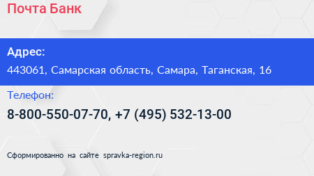 Почта Банк по адресу 443061, Самарская область, Самара, Таганская, 16 в дальнейшем Организация, размещена в следующих категориях:
