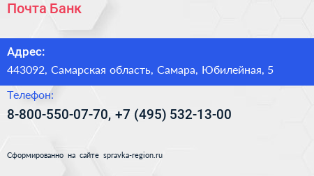 Почта Банк по адресу 443092, Самарская область, Самара, Юбилейная, 5 в дальнейшем Организация, размещена в следующих категориях: