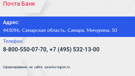 Почта Банк по адресу 443096, Самарская область, Самара, Мичурина, 50 в дальнейшем Организация, размещена в следующих категориях: