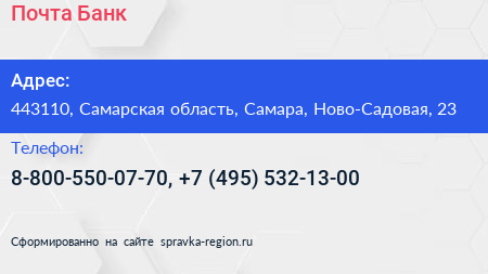 Почта Банк по адресу 443110, Самарская область, Самара, Ново-Садовая, 23 в дальнейшем Организация, размещена в следующих категориях: