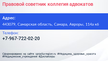 Правовой советник, коллегия адвокатов по адресу 443079, Самарская область, Самара, Авроры, 114а к6 в дальнейшем Организация, размещена в следующих категориях: