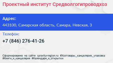 Проектный институт Средволгогипроводхоз по адресу 443100, Самарская область, Самара, Невская, 3 в дальнейшем Организация, размещена в следующих категориях: