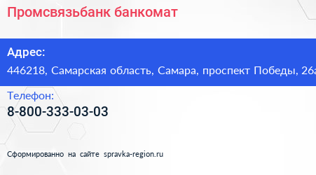 Промсвязьбанк, банкомат по адресу 446218, Самарская область, Самара, проспект Победы, 26а в дальнейшем Организация, размещена в следующих категориях:
