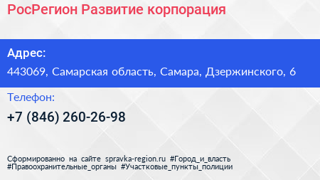 РосРегион Развитие, корпорация по адресу 443069, Самарская область, Самара, Дзержинского, 6 в дальнейшем Организация, размещена в следующих категориях: