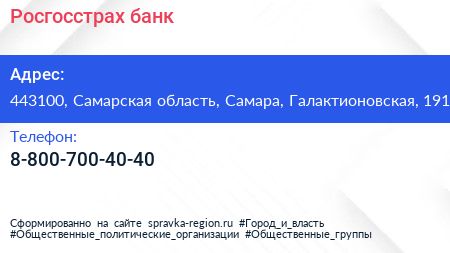 Росгосстрах банк по адресу 443100, Самарская область, Самара, Галактионовская, 191 в дальнейшем Организация, размещена в следующих категориях: