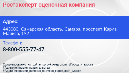 Ростэксперт, оценочная компания по адресу 443080, Самарская область, Самара, проспект Карла Маркса, 192 в дальнейшем Организация, размещена в следующих категориях: