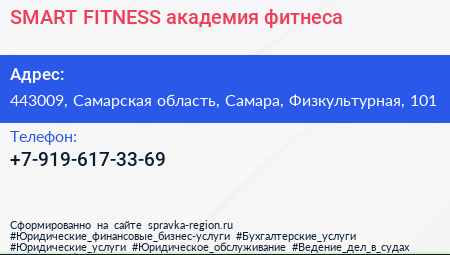 SMART FITNESS, академия фитнеса по адресу 443009, Самарская область, Самара, Физкультурная, 101 в дальнейшем Организация, размещена в следующих категориях: