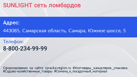 SUNLIGHT, сеть ломбардов по адресу 443085, Самарская область, Самара, Южное шоссе, 5 в дальнейшем Организация, размещена в следующих категориях: