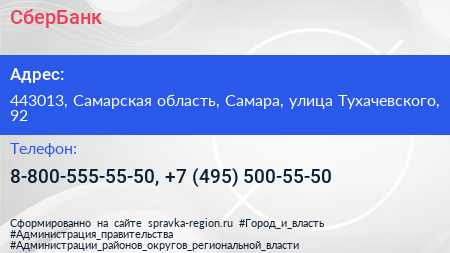 СберБанк по адресу 443013, Самарская область, Самара, улица Тухачевского, 92 в дальнейшем Организация, размещена в следующих категориях: