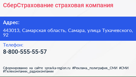 СберСтрахование, страховая компания по адресу 443013, Самарская область, Самара, улица Тухачевского, 92 в дальнейшем Организация, размещена в следующих категориях: