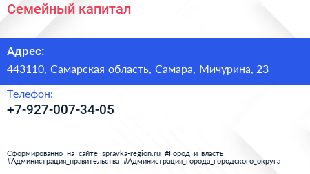Семейный капитал по адресу 443110, Самарская область, Самара, Мичурина, 23 в дальнейшем Организация, размещена в следующих категориях:
