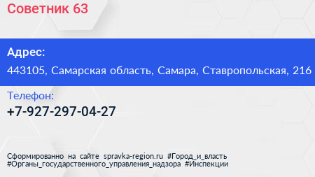 Советник 63 по адресу 443105, Самарская область, Самара, Ставропольская, 216 в дальнейшем Организация, размещена в следующих категориях:
