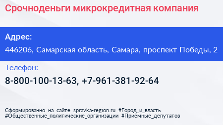 Срочноденьги, микрокредитная компания по адресу 446206, Самарская область, Самара, проспект Победы, 2 в дальнейшем Организация, размещена в следующих категориях: