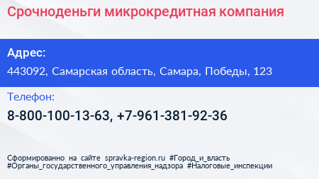 Срочноденьги, микрокредитная компания по адресу 443092, Самарская область, Самара, Победы, 123 в дальнейшем Организация, размещена в следующих категориях: