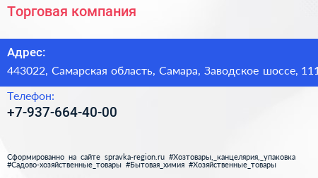 Торговая компания по адресу 443022, Самарская область, Самара, Заводское шоссе, 111 в дальнейшем Организация, размещена в следующих категориях: