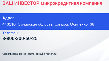 ВАШ ИНВЕСТОР, микрокредитная компания по адресу 443110, Самарская область, Самара, Осипенко, 38 в дальнейшем Организация, размещена в следующих категориях: