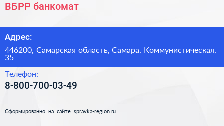 ВБРР, банкомат по адресу 446200, Самарская область, Самара, Коммунистическая, 35 в дальнейшем Организация, размещена в следующих категориях: