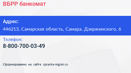 ВБРР, банкомат по адресу 446213, Самарская область, Самара, Дзержинского, 6 в дальнейшем Организация, размещена в следующих категориях: