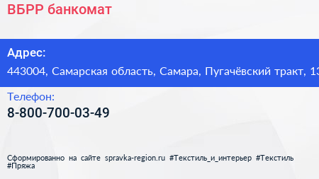 ВБРР, банкомат по адресу 443004, Самарская область, Самара, Пугачёвский тракт, 13 в дальнейшем Организация, размещена в следующих категориях: