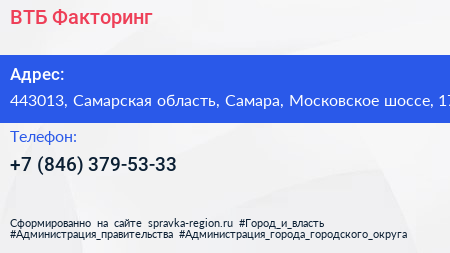 ВТБ Факторинг по адресу 443013, Самарская область, Самара, Московское шоссе, 17 в дальнейшем Организация, размещена в следующих категориях: