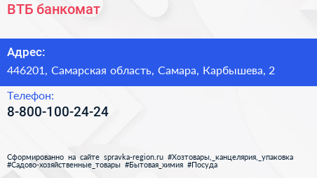 ВТБ, банкомат по адресу 446201, Самарская область, Самара, Карбышева, 2 в дальнейшем Организация, размещена в следующих категориях: