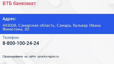ВТБ, банкомат по адресу 443028, Самарская область, Самара, бульвар Ивана Финютина, 20 в дальнейшем Организация, размещена в следующих категориях: