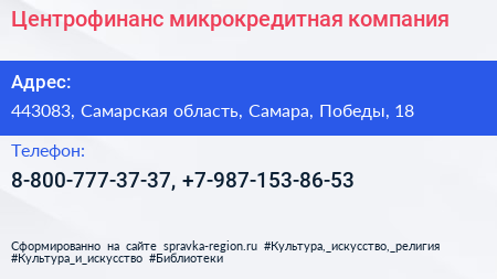 Центрофинанс, микрокредитная компания по адресу 443083, Самарская область, Самара, Победы, 18 в дальнейшем Организация, размещена в следующих категориях: