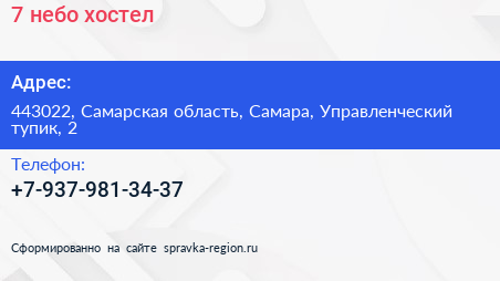 7 небо, хостел по адресу 443022, Самарская область, Самара, Управленческий тупик, 2 в дальнейшем Организация, размещена в следующих категориях: