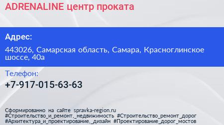 ADRENALINE, центр проката по адресу 443026, Самарская область, Самара, Красноглинское шоссе, 40а в дальнейшем Организация, размещена в следующих категориях: