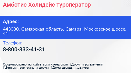 Амботис Холидейс, туроператор по адресу 443080, Самарская область, Самара, Московское шоссе, 41 в дальнейшем Организация, размещена в следующих категориях: