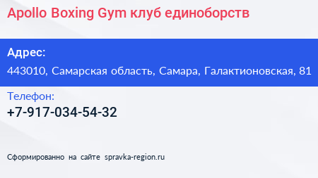 Apollo Boxing Gym, клуб единоборств по адресу 443010, Самарская область, Самара, Галактионовская, 81 в дальнейшем Организация, размещена в следующих категориях: