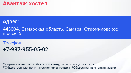 Авантаж, хостел по адресу 443004, Самарская область, Самара, Стромиловское шоссе, 5 в дальнейшем Организация, размещена в следующих категориях: