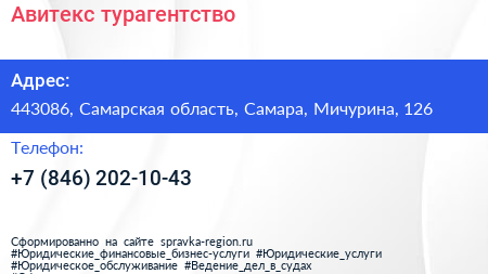 Авитекс, турагентство по адресу 443086, Самарская область, Самара, Мичурина, 126 в дальнейшем Организация, размещена в следующих категориях: