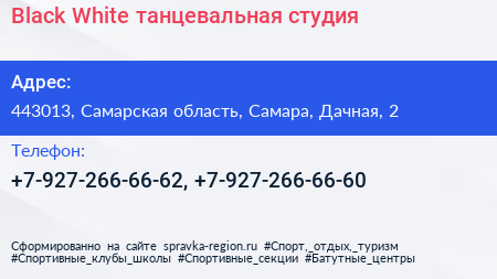 Black & White, танцевальная студия по адресу 443013, Самарская область, Самара, Дачная, 2 в дальнейшем Организация, размещена в следующих категориях: