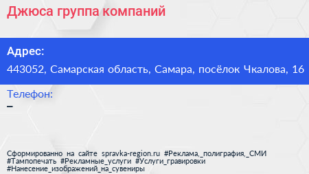 Джюса, группа компаний по адресу 443052, Самарская область, Самара, посёлок Чкалова, 16 в дальнейшем Организация, размещена в следующих категориях: