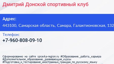 Дмитрий Донской, спортивный клуб по адресу 443100, Самарская область, Самара, Галактионовская, 132 в дальнейшем Организация, размещена в следующих категориях:
