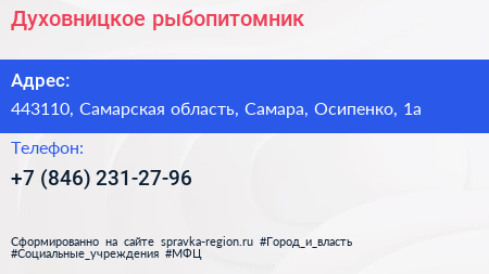 Духовницкое, рыбопитомник по адресу 443110, Самарская область, Самара, Осипенко, 1а в дальнейшем Организация, размещена в следующих категориях: