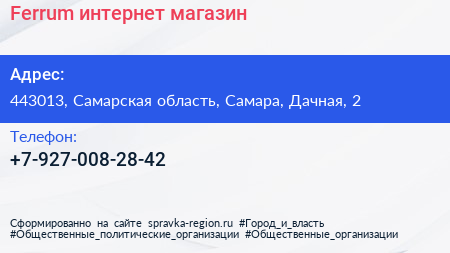 Ferrum, интернет-магазин по адресу 443013, Самарская область, Самара, Дачная, 2 в дальнейшем Организация, размещена в следующих категориях: