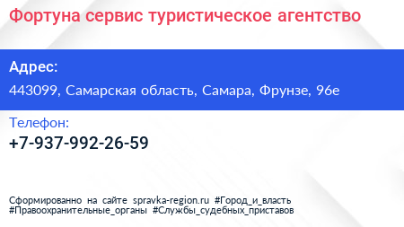 Фортуна-сервис, туристическое агентство по адресу 443099, Самарская область, Самара, Фрунзе, 96е в дальнейшем Организация, размещена в следующих категориях:
