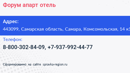 Форум, апарт-отель по адресу 443099, Самарская область, Самара, Комсомольская, 14 к1 в дальнейшем Организация, размещена в следующих категориях: