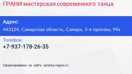 ГРАНИ, мастерская современного танца по адресу 443124, Самарская область, Самара, 5-я просека, 99а в дальнейшем Организация, размещена в следующих категориях: