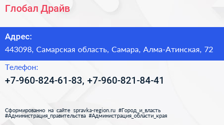 Глобал Драйв по адресу 443098, Самарская область, Самара, Алма-Атинская, 72 в дальнейшем Организация, размещена в следующих категориях:
