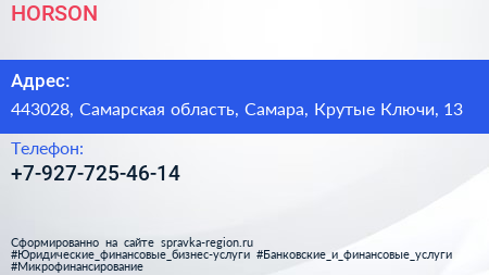 HORSON по адресу 443028, Самарская область, Самара, Крутые Ключи, 13 в дальнейшем Организация, размещена в следующих категориях: