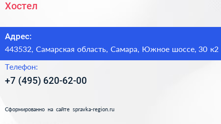 Хостел по адресу 443532, Самарская область, Самара, Южное шоссе, 30 к2 в дальнейшем Организация, размещена в следующих категориях: