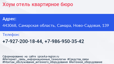 Хоум отель, квартирное бюро по адресу 443068, Самарская область, Самара, Ново-Садовая, 139 в дальнейшем Организация, размещена в следующих категориях: