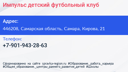 Импульс, детский футбольный клуб по адресу 446208, Самарская область, Самара, Кирова, 21 в дальнейшем Организация, размещена в следующих категориях: