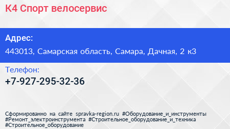К4 Спорт, велосервис по адресу 443013, Самарская область, Самара, Дачная, 2 к3 в дальнейшем Организация, размещена в следующих категориях: