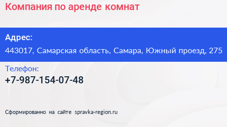 Компания по аренде комнат по адресу 443017, Самарская область, Самара, Южный проезд, 275 в дальнейшем Организация, размещена в следующих категориях: