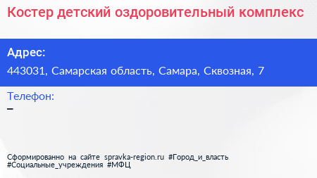 Костер, детский оздоровительный комплекс по адресу 443031, Самарская область, Самара, Сквозная, 7 в дальнейшем Организация, размещена в следующих категориях: